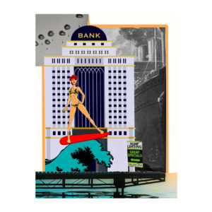 Juxtaposed against the surfer’s ethereal presence, an imposing bank emerges, its architectural grandeur a testament to the solid foundations of power and wealth. Symbolic of the modern world’s financial systems, it hints at the complex dynamics between ambition, success, and the pursuit of dreams.